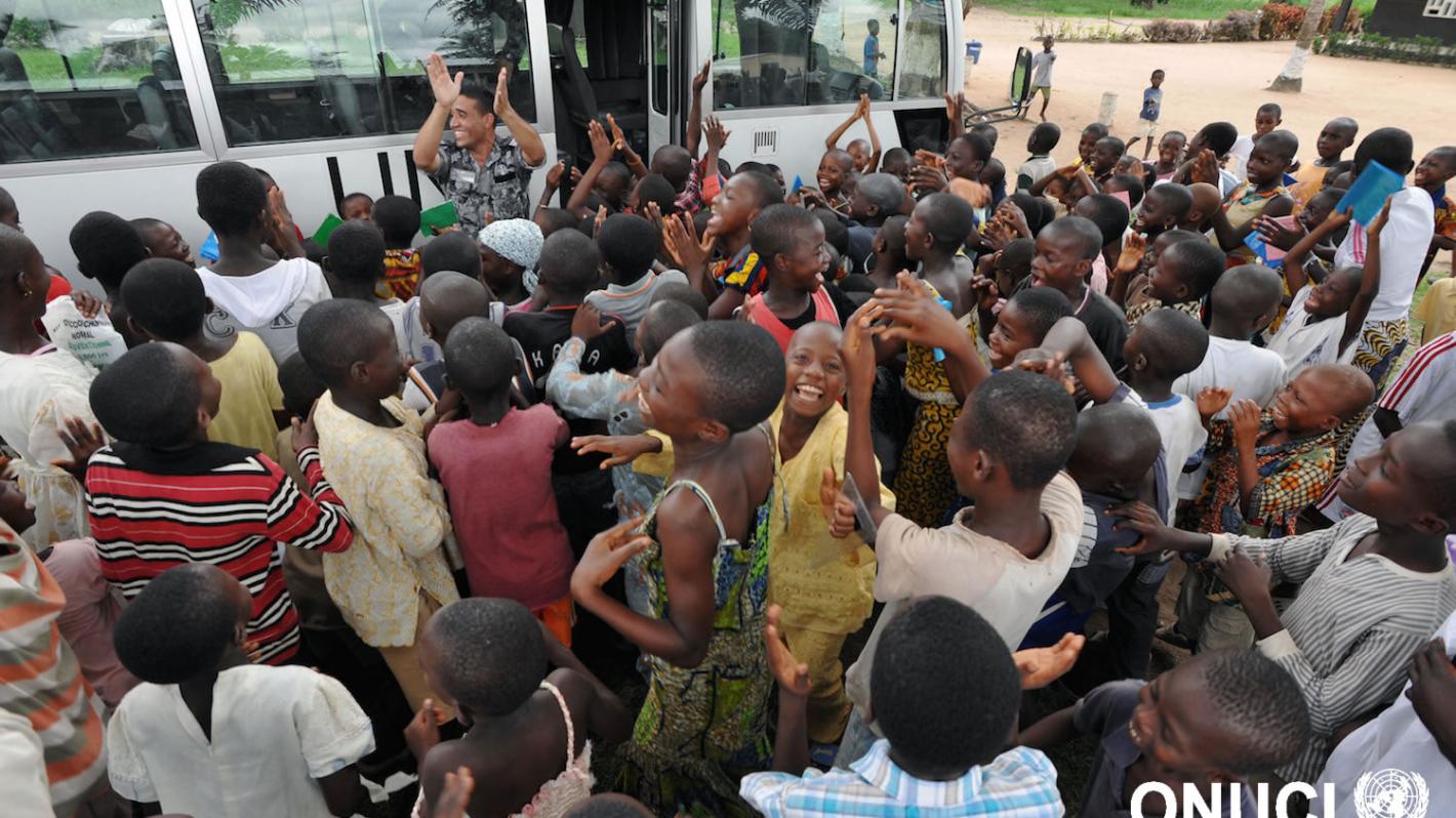 Children from the primary school in Kakoukro village give an enthusiastic welcome to UNOCI's Formed Police Unit who came to provide them with free medical treatment (Kakoukro, May 2010)