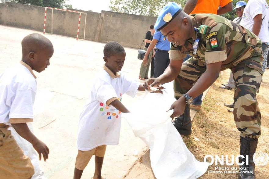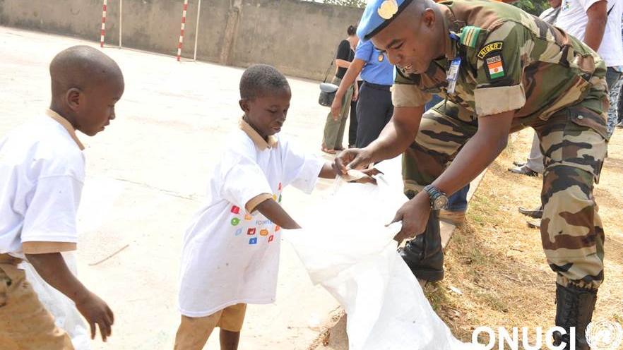 A clean-up operation organized as part of the 42nd edition of United Nations Days: a UNOCI peacekeeper helps children to collect dead leaves (Dimbokro, February 2016)