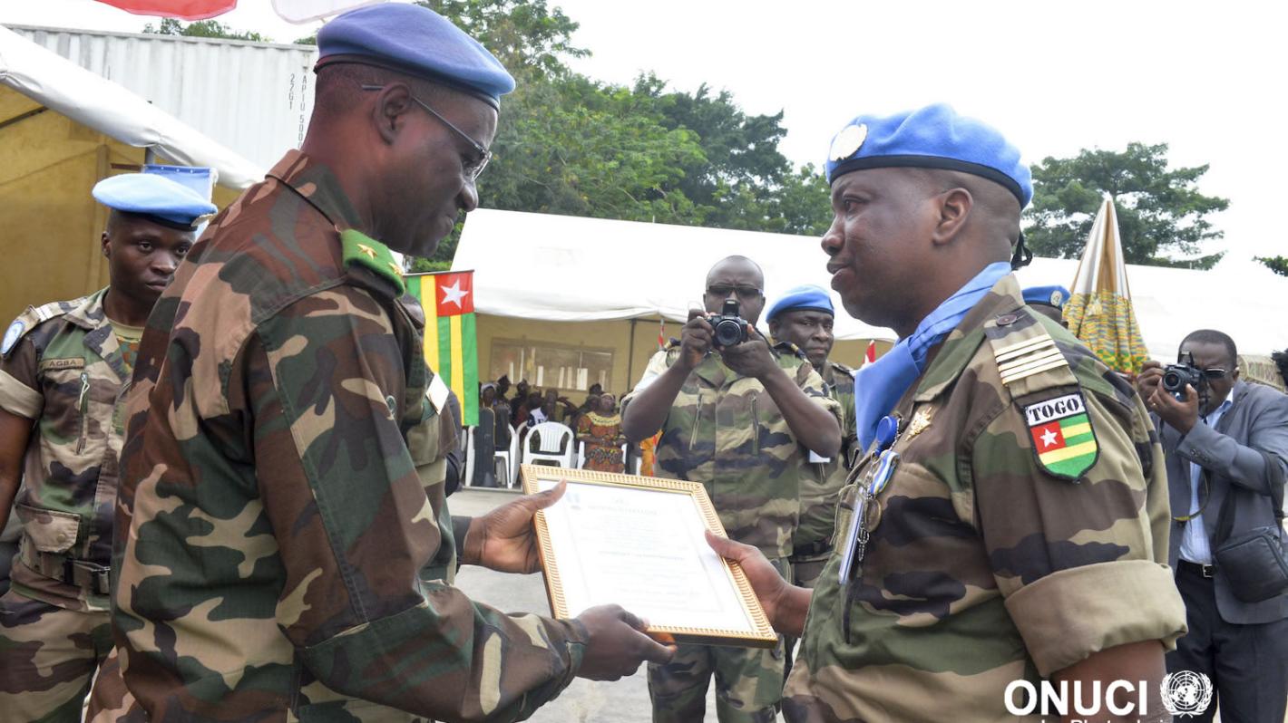 Medal Awarding to Togolese peacekeepers : the Deputy Force Commander of UNOCI handing over the certificate to the Chief of the contingent ( Abidjan, August 2016 )