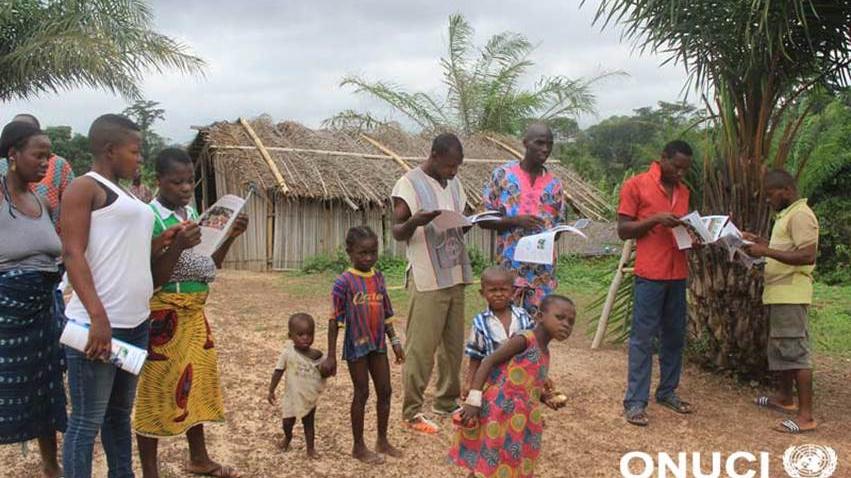 People in Zeitouo village reading copies of UNOCI’s newsletter ‘’La Force de la Paix’’ on the work of the UN Mission’s peacekeepers (Zeitouo, near Toulepleu, March 2016)