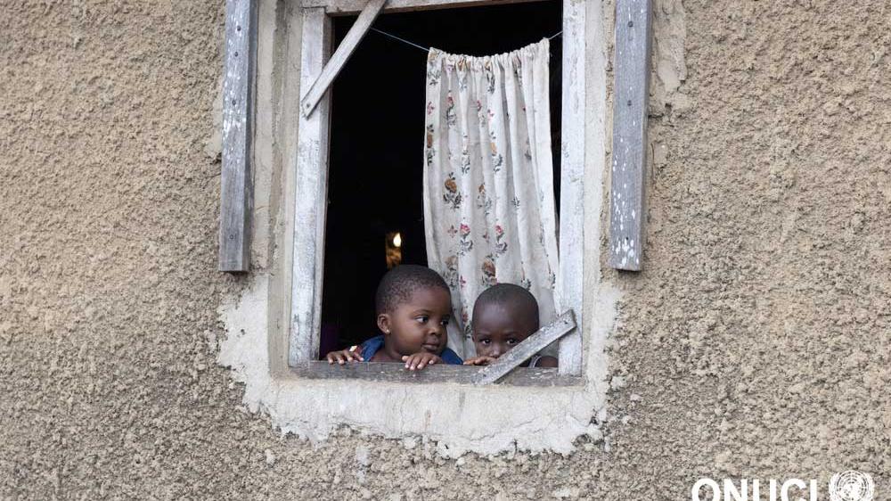 From a distance, two children observe the inauguration ceremony of the youth centre in the Jérulsalem neighbourhood of Attecoube rehabilitated by UNOCI (Abidjan, September 2014)