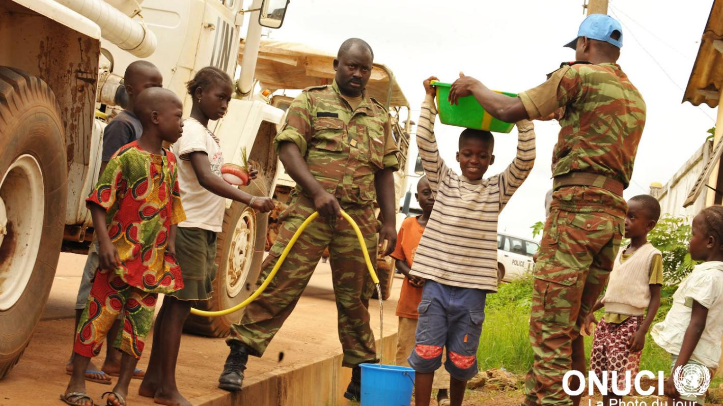 Beninese peacekeepers distribute drinking water to the population during ‪UNOCI‬ Days in Gagnoa (October 2011)