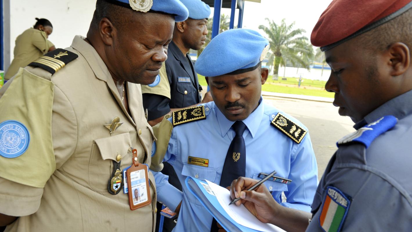 Exchanges between Ivorian National Police and United Nations Police officers at the opening ceremony of a UNPOL liaison office at the Gendarmerie School (Abidjan, January 2012)