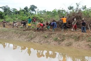 Three young women are competing with the menfolk as they struggle to dig a gutter that would channel water into newly constructed fish ponds. Aimee Ouluzon, Laure Oulai and Olga Sea are among 25 ex-combatants who decided to take up fish farming after a one- month training programme at the re-socialisation centre in Bouafle during which they were also taught the basic notions of human rights, citizenship and non-violence.