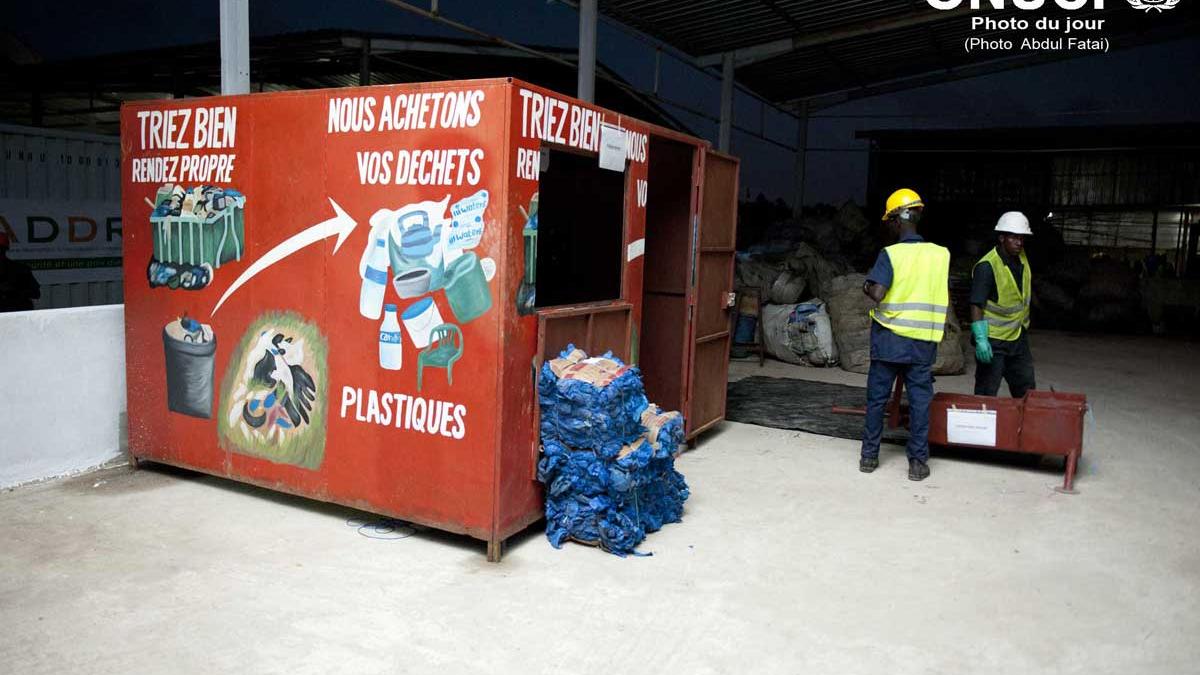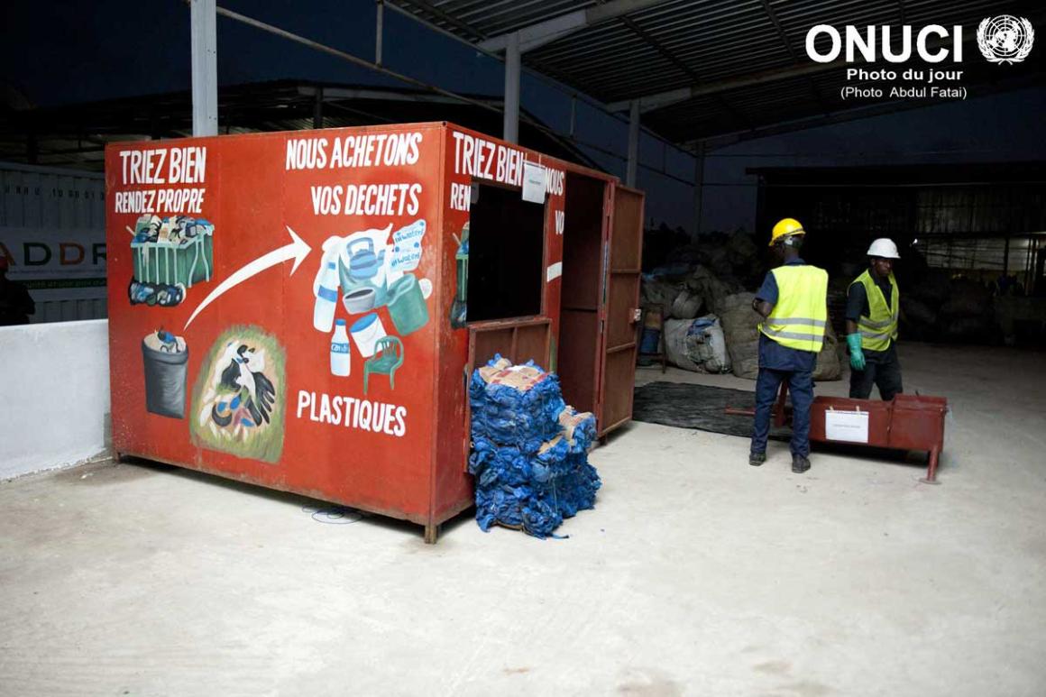 Ex-combatants working actively in the transformation of plastic waste unit set up by the former the national Authority for Disarmament, Demobilisation and Reintegration (ADDR) in Attecoube (Abidjan, December 2014)