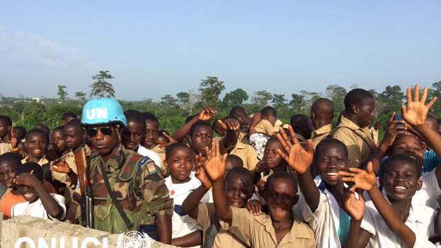 Excited pupils from the secondary modern school in Bayota, which is to benefit from a building project comprising a canteen and six classes, welcome an UNOCI delegation (Bayota, November 2015)