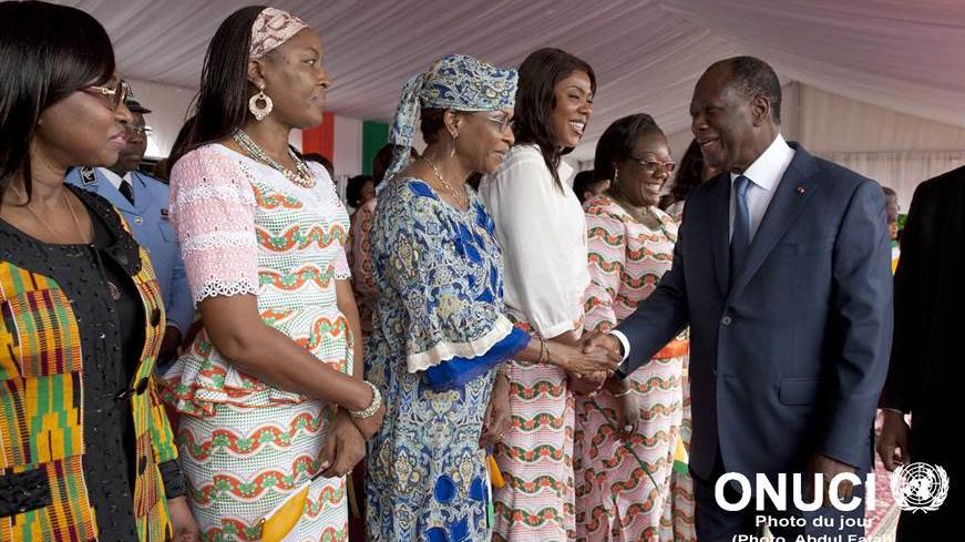 Ivorian President Alassane Ouattara greeting women leaders, including the head of UNOCI, who attended the official ceremony commemorating International Women’s Day (Abidjan, March 2016)