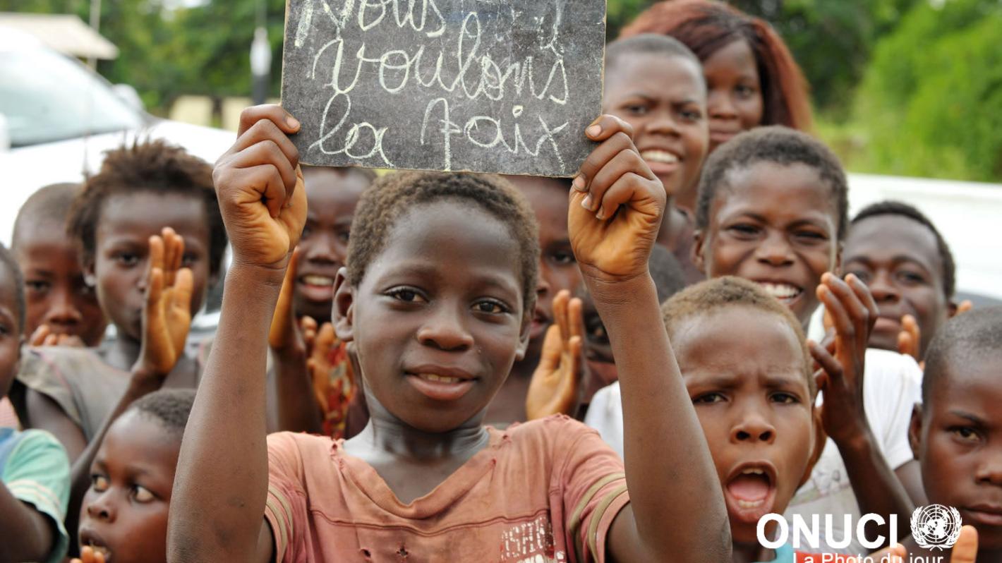 Children of the village of Diahouin, near Blolequin want peace. They made it clear to a visiting UN delegation following the post-electoral crisis (Diahouin, June 2011)