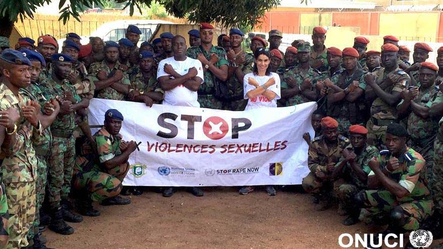 Republican Forces of Côte d’Ivoire hold banner saying no to sexual violence at the end of a sensitisation session organized by UNOCI and the FRCI General Staff Office (Boundoukou, May 2016)