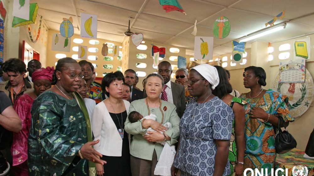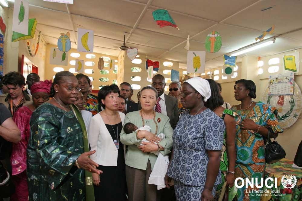 Mrs Ban Soon-taek, wife of the United Nations Secretary-General, Ban Ki-moon, visiting a nursery school rehabilitated and furnished by UNOCI in Adjame, Abidjan (Abidjan, April 2008)
