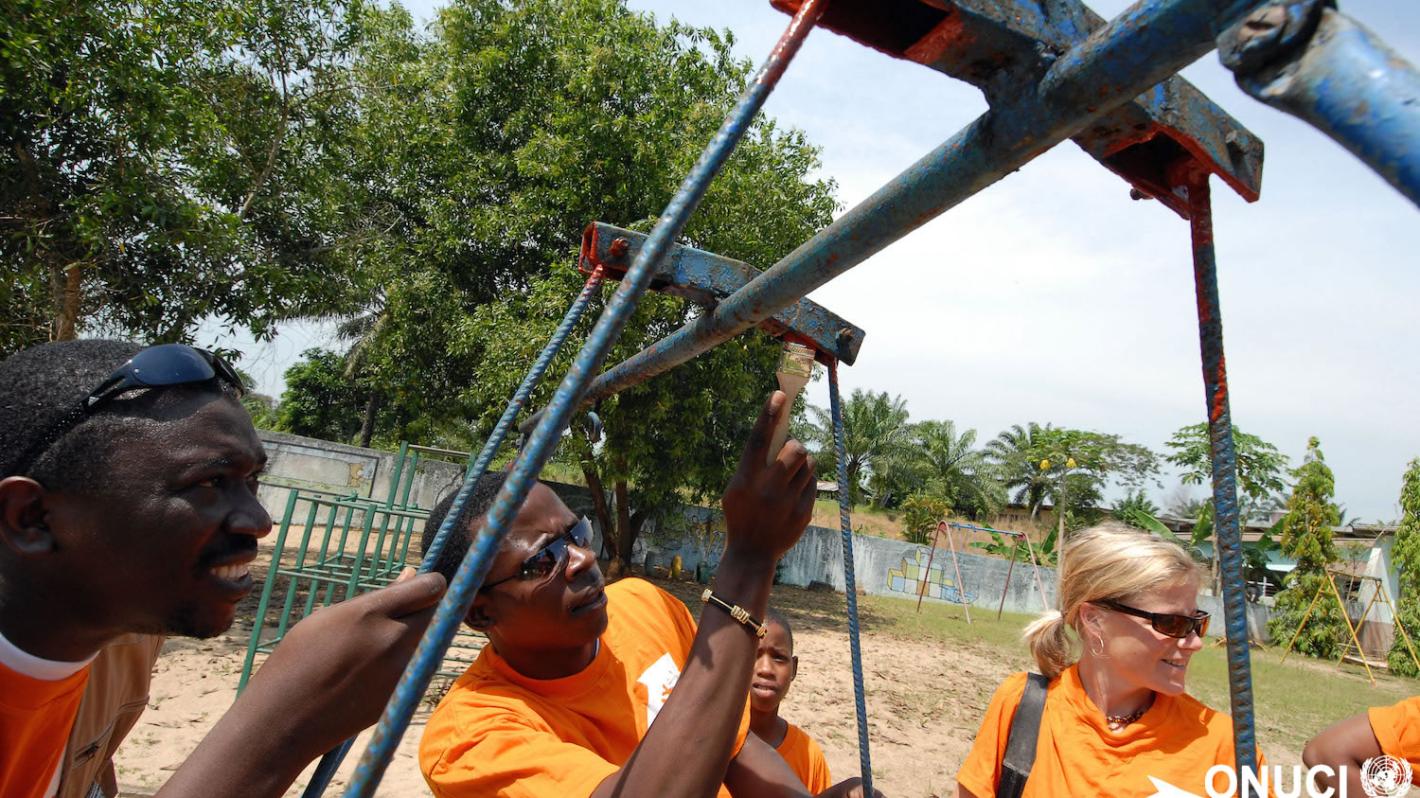 Rehabilitation of the Aboisso orphanage playground: United Nations Volunteers paint a swing (Aboisso, December 2007)