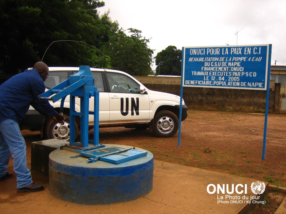 The rehabilitation of an hydraulic pump by UNOCI through its Quick Impact Project programme, has allowed the population of Napie to have access to safe drinking water (Napié, April 2005)