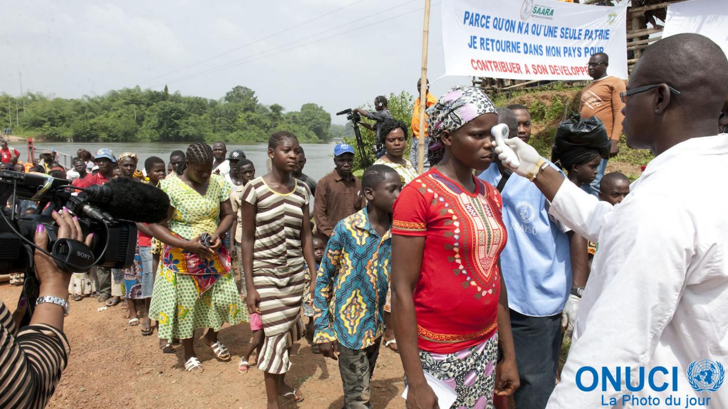 The return of Ivorian refugees from Liberia facilitated by UNHCR and UNOCI: Returnees undergo routine health checks after stepping off a boat (Prollo, near the Ivorian-Liberian border, December 2015)