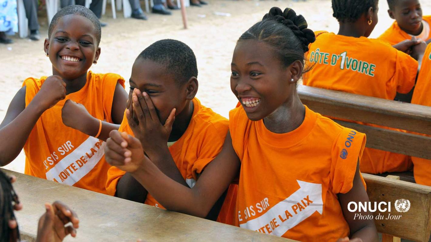 Schoolgirls celebrating the rights answers at a quiz organized by UNOCI during a sensitization caravan in Adjame (Abidjan) in March 2012 ((Photo UNOCI/Macline Hien)