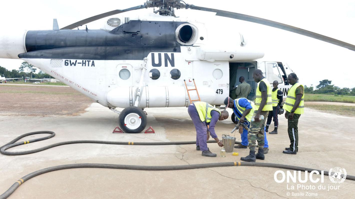 Senegalese Contingent troops check the fuel quality before filling-up helicopter tank for an air operation (Daloa, August 2016)