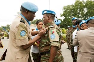 The soldiers were decorated by UNOCI Deputy Force Commander, General Talla Niang. The medal is a mark of the United Nations recognition of the professionalism of the Beninese soldiers' accomplishment of their mission and their commitment to the cause of peace in Côte d'Ivoire.