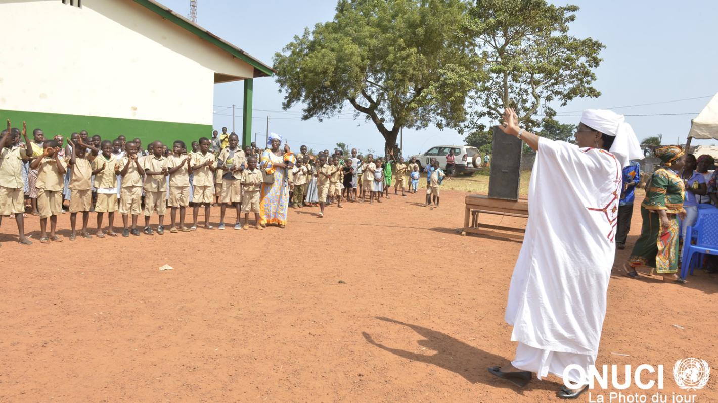 The Special Representative acknowledges a warm welcome from pupils of the public primary school in Tabou ll, which was rehabilitated by UNOCI, as part of its Quick Impact Projects programme (Tabou, March 2016)