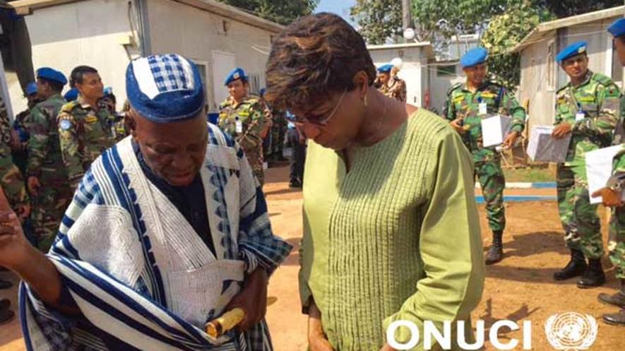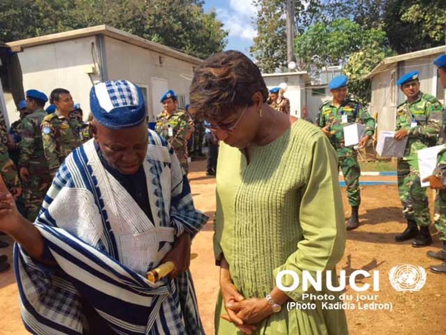 Special Representative, Aïchatou Mindaoudou, and the chairman of the Peace Council of Guémon, François Batahi, in deep discussion after a medal parade ceremony for UNOCI's Moroccan Contingent (Duekoue, November 2015)