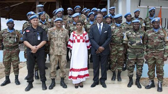 The Special Representative of the United Nations Secretary-General for Côte d'Ivoire, Mrs Aïchatou Mindaoudou, on Tuesday, 29 September 2015, presided over the medal parade ceremony for 370 peacekeepers from the 20th Benin Contingent (BENINBATT) in the presence of the Force Commander of the United Nations Operation in Côte d'Ivoire (UNOCI), General Didier L'Hôte and the Benin Ambassador to Côte d'Ivoire. This prestigious event for military personnel serving in UN Missions is held in recognition of the devotion to duty, their professionalism, their arduous work and their contribution to the restoration of peace.