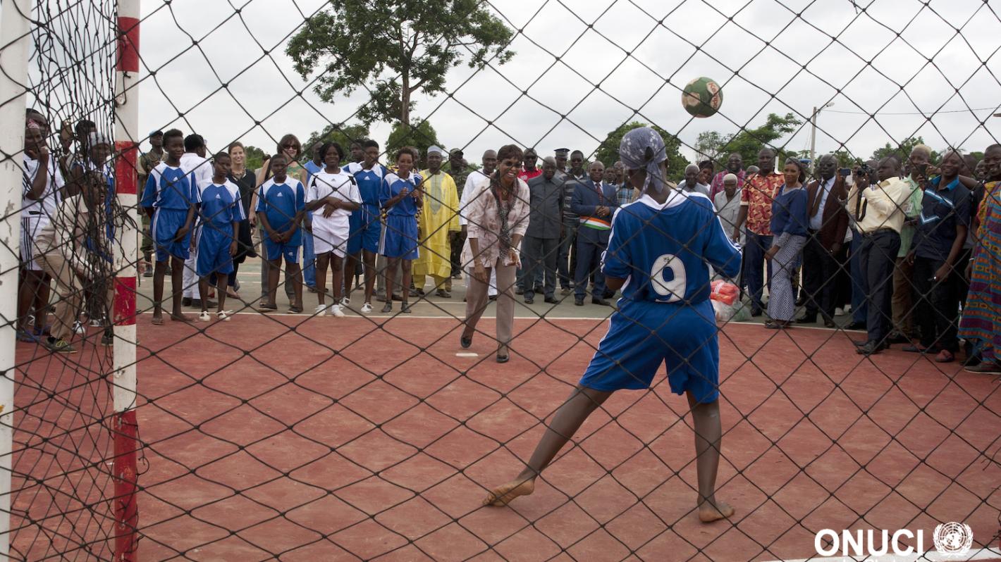 The Special Representative tries her skills at handball during the inauguration of the Agnibilekrou multi-sports complex financed by UNOCI under the Mission’s Quick Impact Project Programme (July 2016)