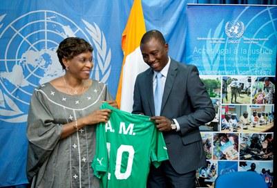 The Special Representative of UN Secretary General for Cote d'Ivoire, Mrs Aichatou Mindaoudou, salutes the victory of the Elephants at the 30th African Cup of Nations (ACN) football final, which took place in Equatorial Guinea on Sunday February 8, 2015.