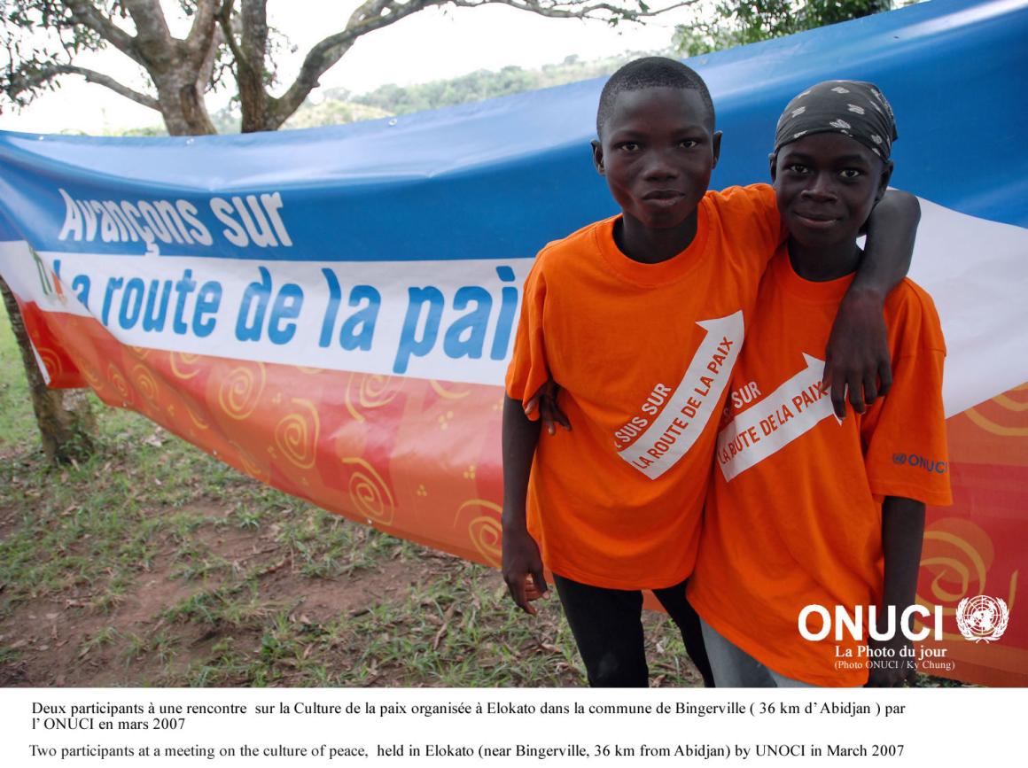 HomeTwo participants at a meeting on the culture of peace, held in Elokato (near Bingerville, 36 km from Abidjan) by UNOCI in March 2007 Two participants at a meeting on the culture of peace, held in Elokato (near Bingerville, 36 km from Abidjan) by UNOCI in March 2007 14 April 2015Share