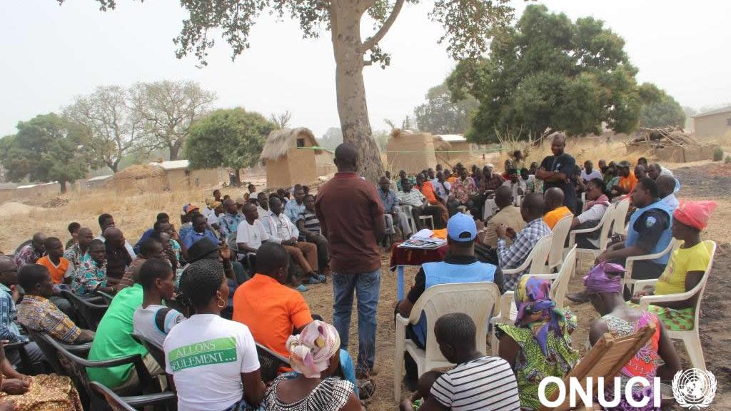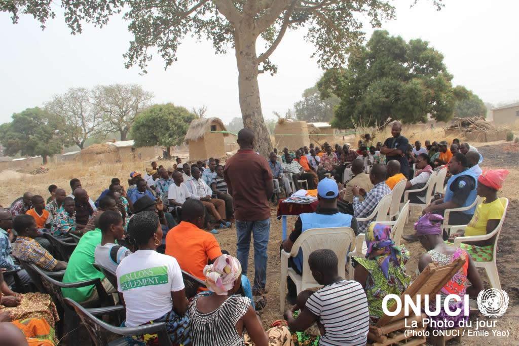 Under the shade of a tree, in village of Bromonkote, the population and UN officers exchanging on peace promotion and social cohesion (Bromonkote, January 2016)
