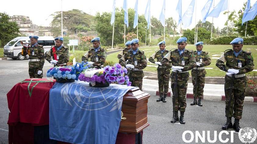 UNOCI pays tribute to a Moroccan peacekeeper who died in a road accident while transporting UNHCR tents to homeless people in Néko village, near Lakota (Abidjan, November 2015 )