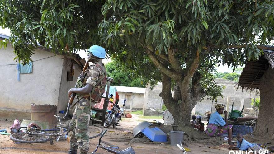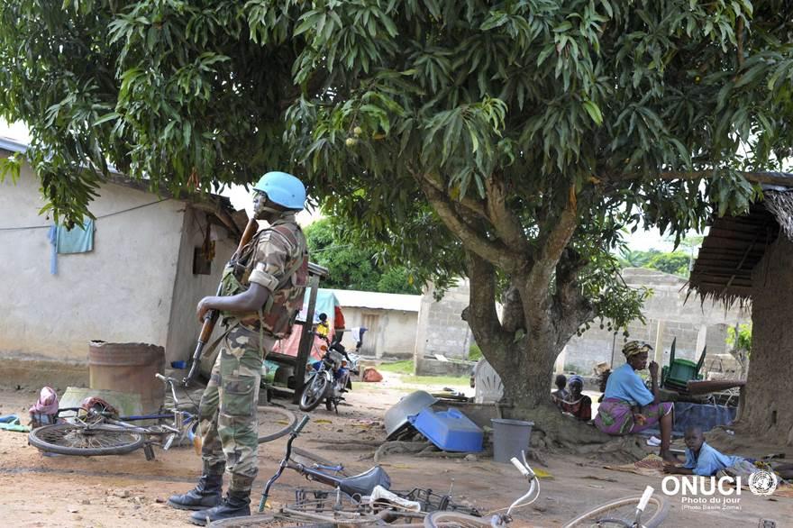 An UNOCI peacekeeper provides security in Neko following a violent incident in the village which resulted in one death and destruction of property (Neko, in Lakota department, November 2015)