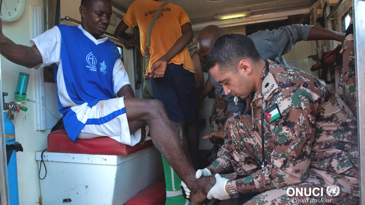 A UNOCI peacekeeper treats an injured sportsman during UN Days organized in Sikensi in March 2012 (Photo ONUCI/ Patricia Estheve)