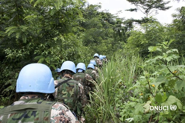 UNOCI peacekeepers carrying out a protection of civilians exercise in the west of the country as part of a security operation entitled « Umbrella » (Yoya, near Blolequin, October 2009)