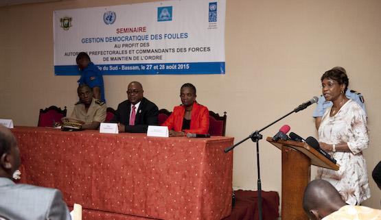 The Special Representative of the United Nations Secretary-General for Côte d'Ivoire, Mrs Aïchatou Mindaoudou, on Thursday, 27 August 2015, participated in the opening ceremony of the second seminar on democratic crowd control for prefects and law enforcement commanders in Grand Bassam.