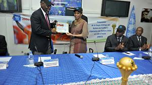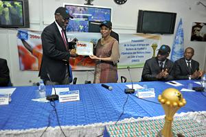 The ceremony ended with the presentation of gifts to members of the Executive Committee, including a football stamped with UNOCI's name and logo and signed by the head of the UN Mission, as well as a certificate with the notation « UNOCI congratulates the Ivorian Football Federation for its commitment to national reconciliation in Côte d'Ivoire ». This was presented by the UN Mission in recognition of its efforts to reunite all Ivorians by using the sport to promote peace in Côte d'Ivoire.