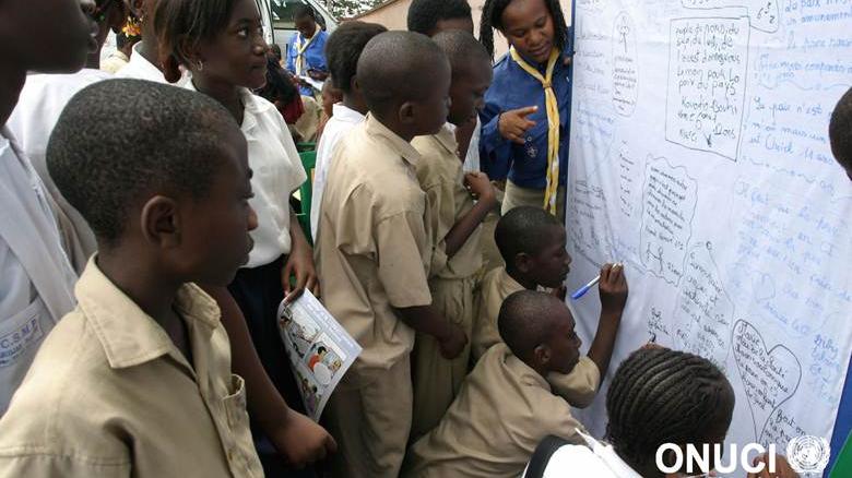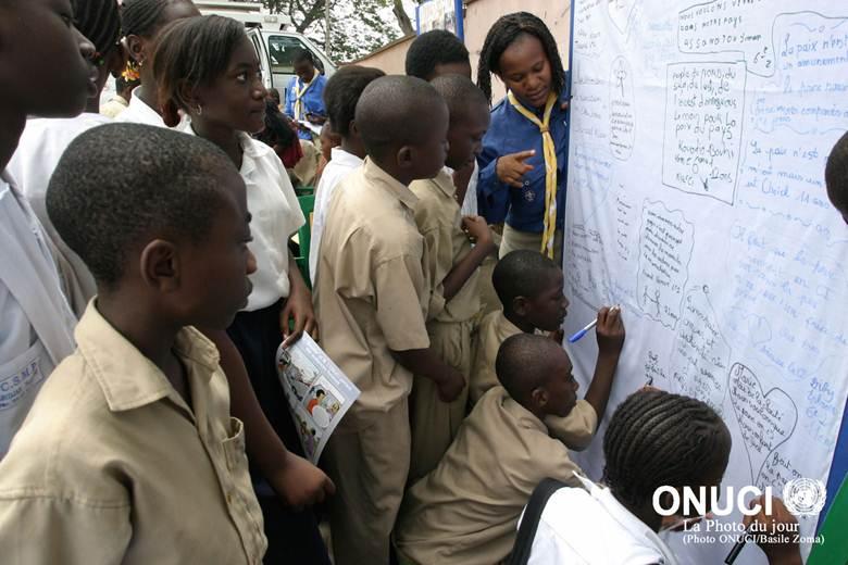 HomeUNOCI’s Sensitisation Caravan at CSMT schools in Plateau : children writing their messages of peace (Abidjan, March 2007) UNOCI’s Sensitisation Caravan at CSMT schools in Plateau : children writing their messages of peace (Abidjan, March 2007) 19 May 2015Share