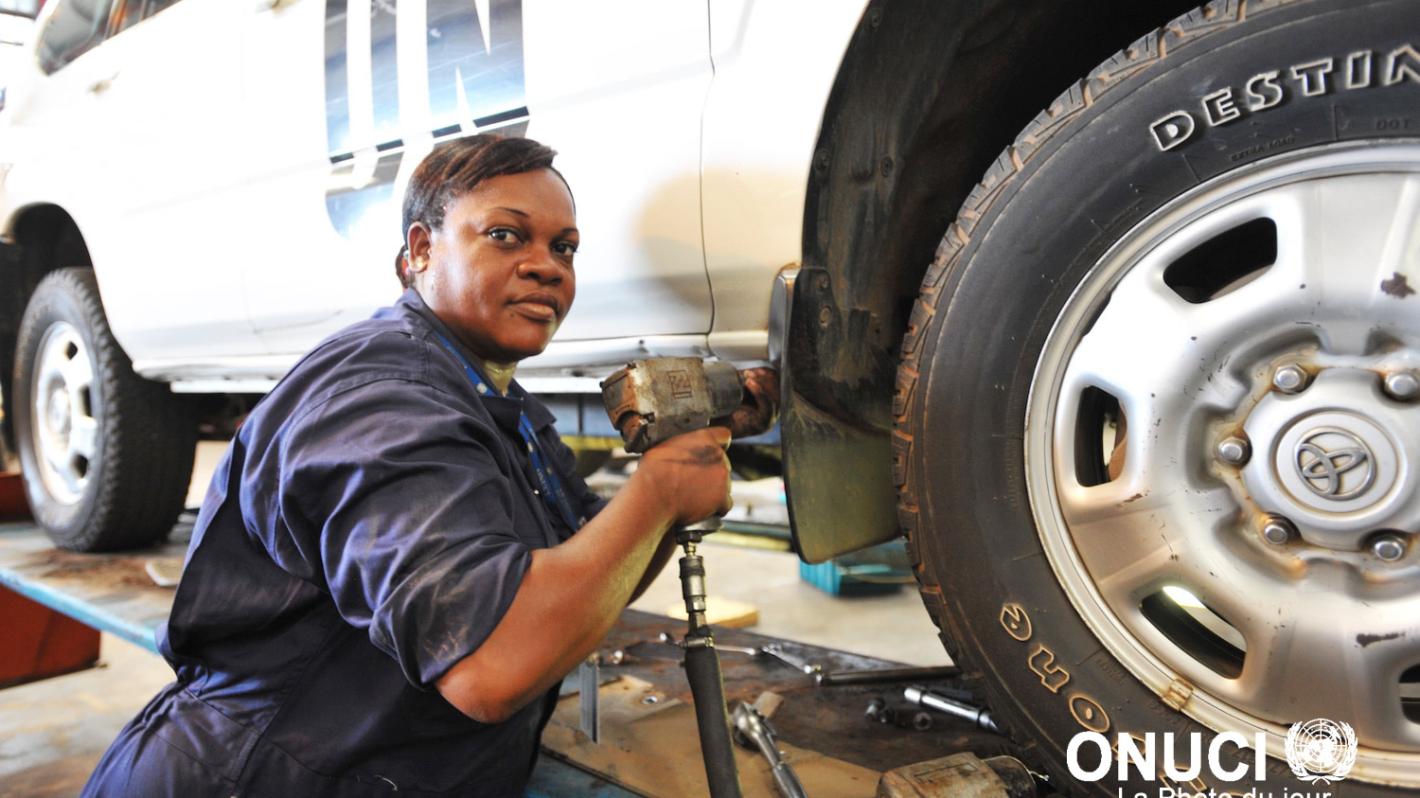 Who says only men can fix cars? Certainly not this mechanic who stands ready to tackle any repair work in UNOCI’s Transport Section (Abidjan, July 2012)