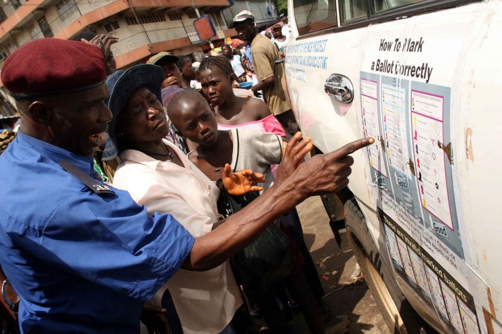 A policeman uses a poster to show a woman how to mark a ballot correctly in Freetown days ahead of the country’s presidential elections on 11 August 2007. Thanks to security forces, Sierra Leone organized, in 2007, violence-free election after 11 years of civil war. Credit: IRIN