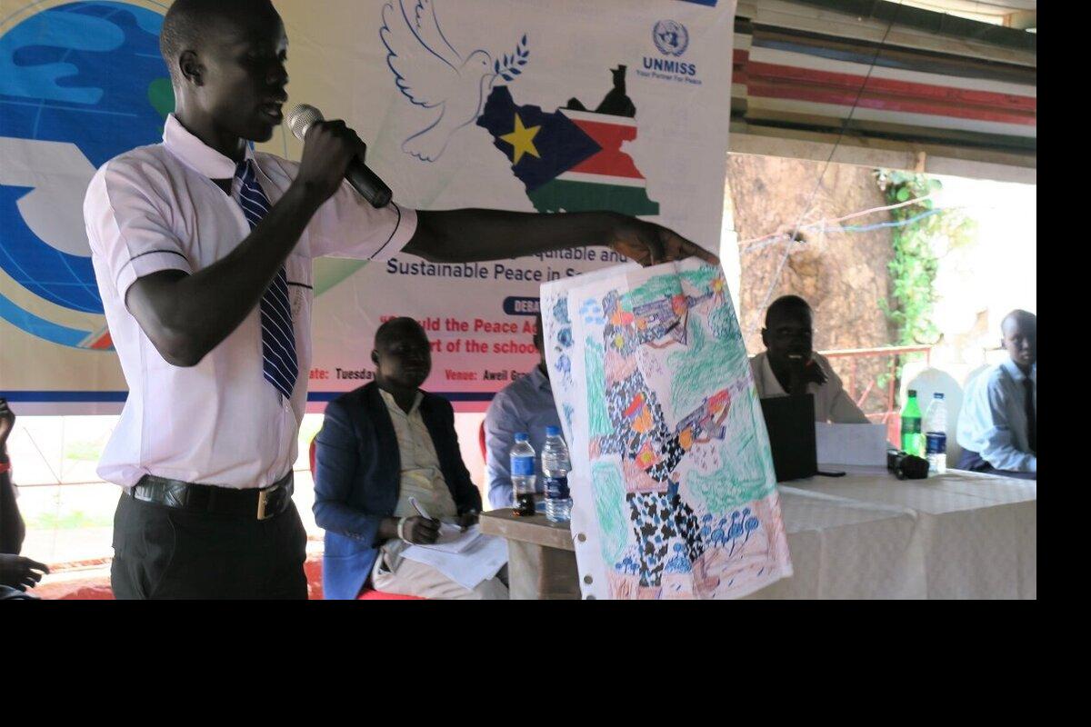 To mark International Day of Peace, UNMISS organized a debate for students from Northern Bahr El Ghazal on whether the Revitalized Peace Agreement should be taught in schools as part of the regular curriculum. Photo by Emmanuel Kele/UNMISS.