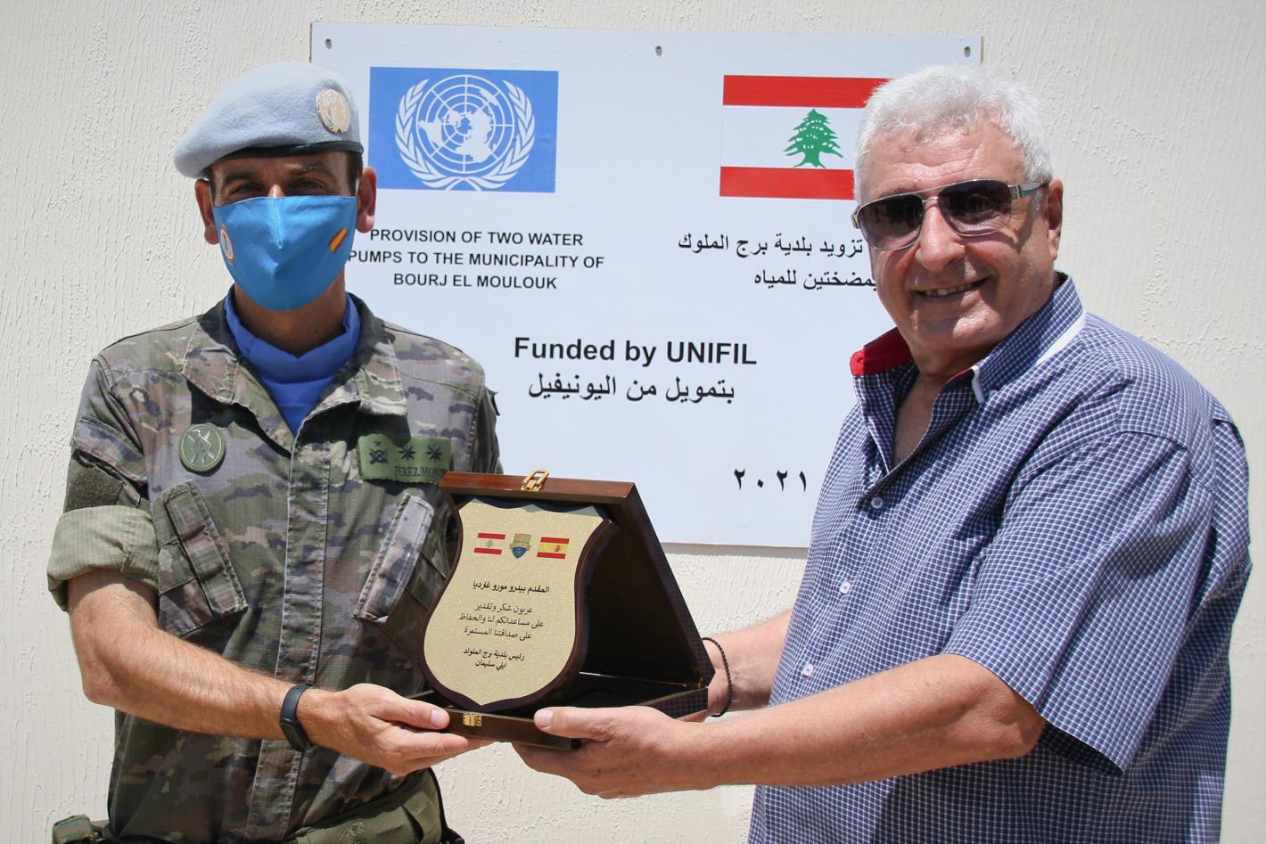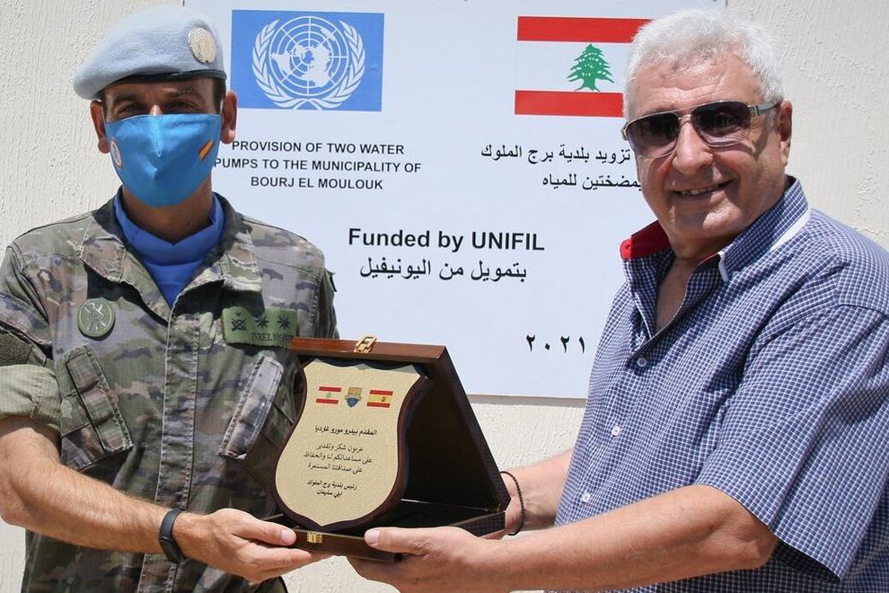 UNIFIL Spanish Battalion Commander Lieutenant Colonel Pérez Montes (left) handed over two water pumps for the local water reservoir to the Mayor of Bourj Al Malouke, Elias Ncoula Seleiman, on 7 July 2021.