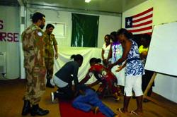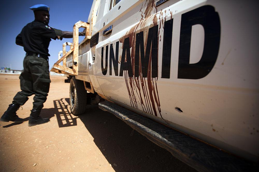 A UNAMID police from Nigeria inspects the ambushed car with remnants of human blood. Photo by Albert González Farran.UNAMID.