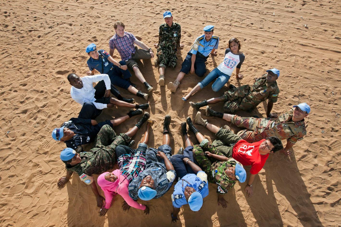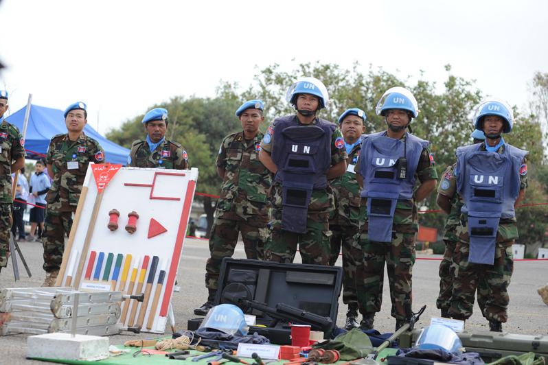 Cambodian peacekeepers demonstrating mine clearance suits and equipment during the International Day of Mine Awareness at UNIFIL HQ in Naqoura