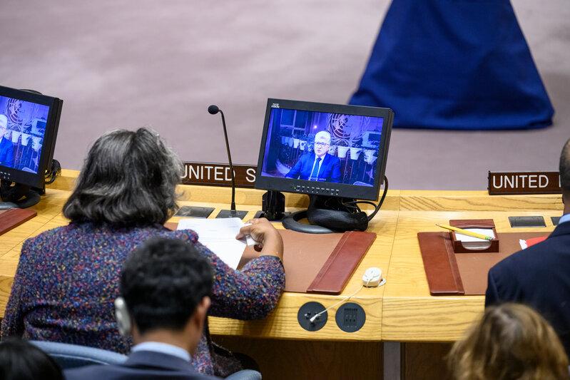 Tor Wennesland, Special Coordinator for the Middle East Peace Process, briefs reporters after the Security Council meeting on the situation in the Middle East, including the Palestinian question. (UN Photo/Loey Felipe - 28 November 2022)
