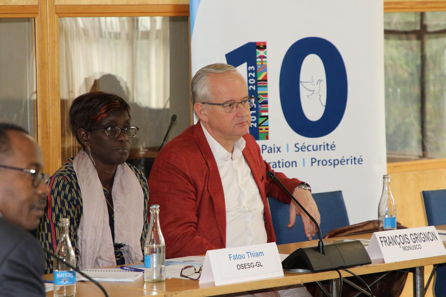 Participants at the meeting of Political Affairs Officers and Peace and Development Advisors of UN presences in the Great Lakes region. From left Ms. Fatou Thiam, Director of the Political Affairs unit in the Office of the Special Envoy for the Great Lakes region, and Mr. François Grignon, Director of MONUSCO Political Affairs Division. Photo: Penangnini Toure