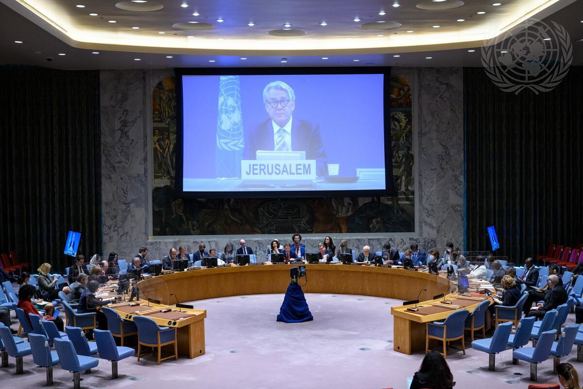 A view of the Security Council meeting on the situation in the Middle East, including the Palestinian question. On the screen is Tor Wennesland, Special Coordinator for the Middle East Peace Process. (27 June 2022 - UN Photo/Loey Felipe)