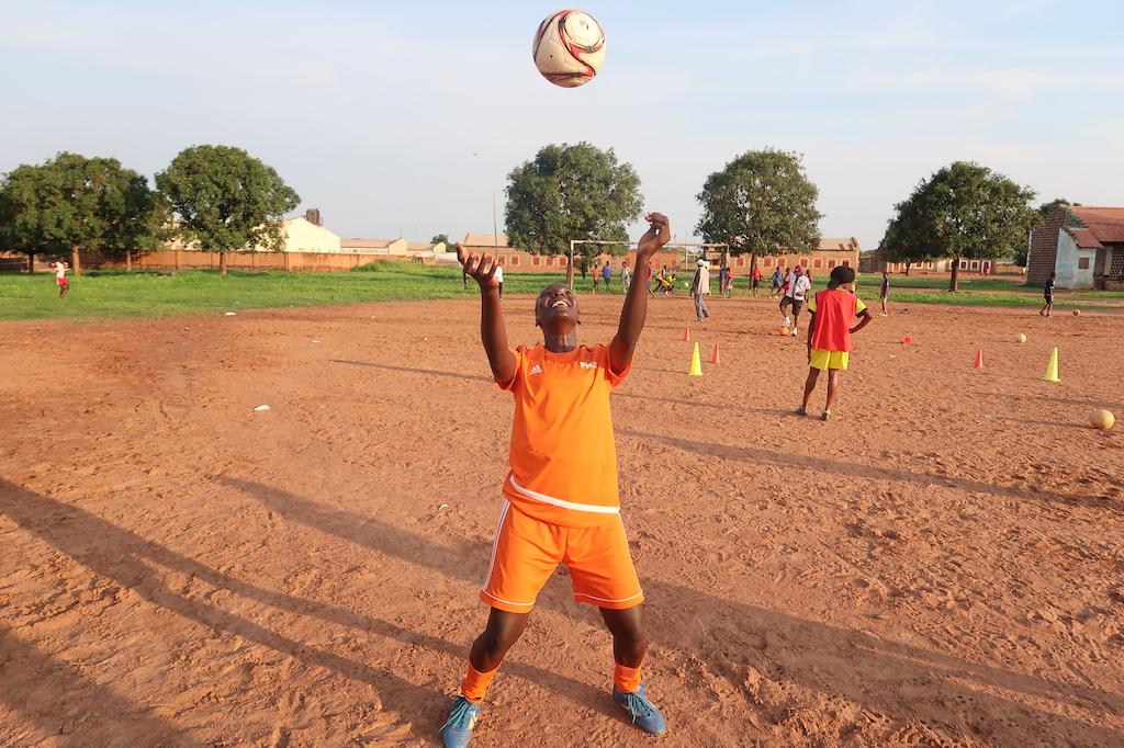 One of the female footballers demonstrating both a new kit and good control of the (also new) ball with her team mates in Wau practicing in the background. Photos: Alahayi Nemaya/UNMISS