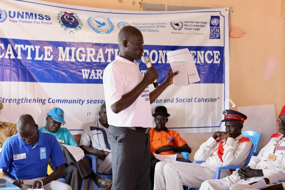 A recent conference in Kuajok organized jointly by UNMISS, UNDP, FAO, and the UN Multi-Partner Trust Fund aims at predicting and preventing conflict that frequently arise between farmers and pastoralists during the annual cattle migration season in South Sudan. Photo by Zejin Yin/UNMISS