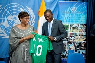 « On behalf of the United Nations, I wish the Elephants, who are the pride of Côte d'Ivoire, and who represent Africa along with Cameroon, Ghana, Algeria and Nigeria in this competition, plenty of success," said the Special Representative of the United Nations Secretary-General for Côte d'Ivoire and head of UNOCI, Mrs Aïchatou Mindaoudou , on Wednesday, 4 June 2014 at a ceremony in UNOCI's headquarters in Sebroko, during which the Ivorian Football Federation - Fédération Ivoirienne de football (FIF) presented her with official football shirt of the Elephants of Côte d'Ivoire,
