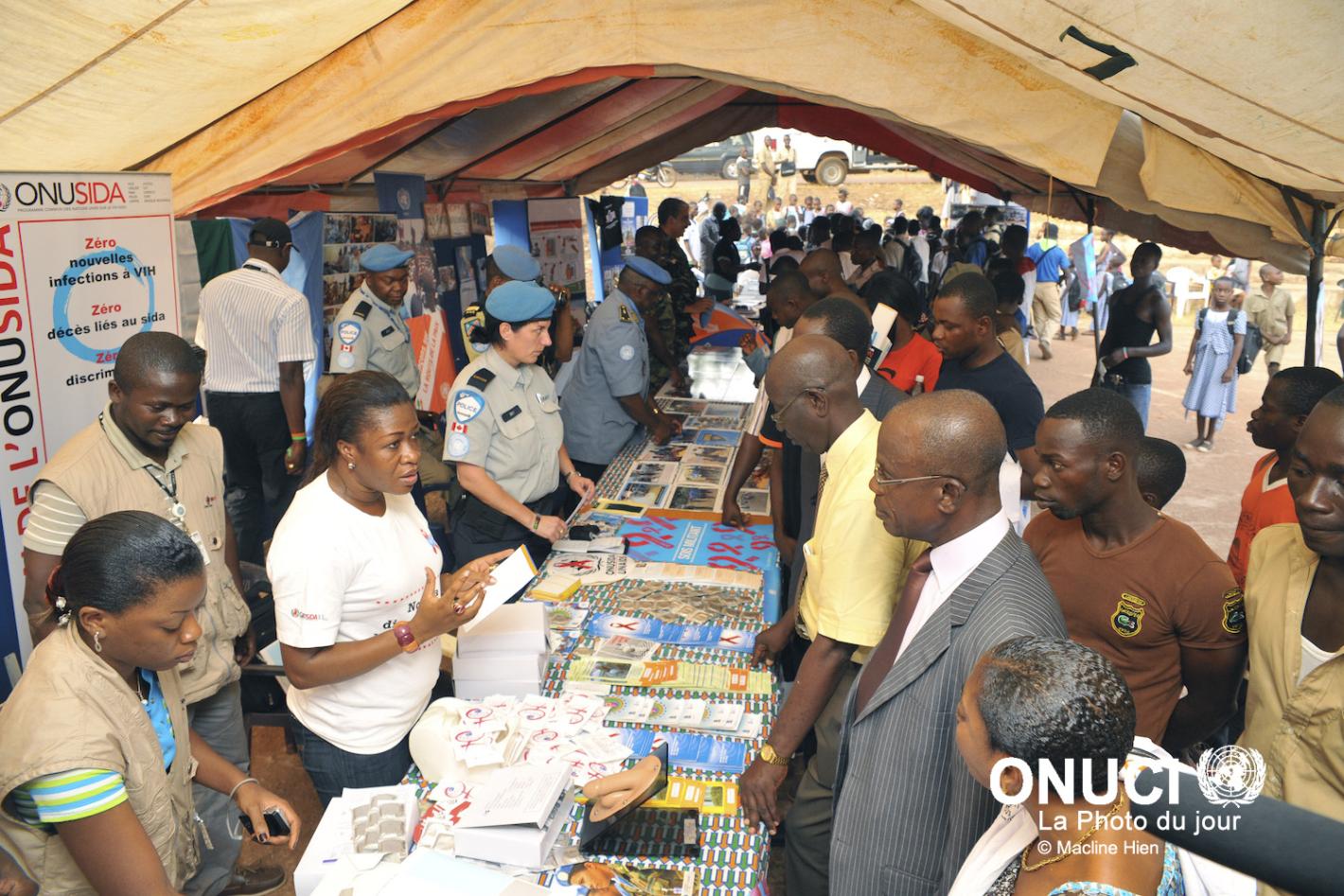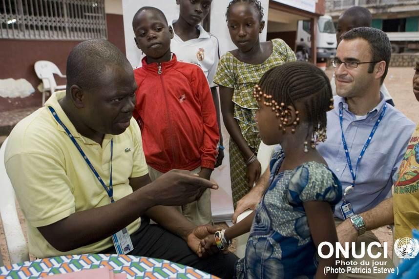 A Civil Affairs Officer, Drissa Ouattara, explains the importance of going to school to a little girl during the Mission’s sensitization campaign known as UNOCI Days (Agboville, February 2012)