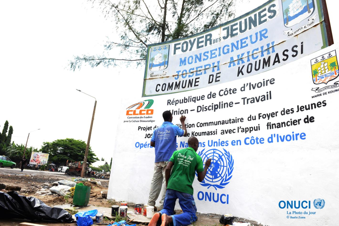 Adding the finishing touches to the signboard of the Koumassi Youth Center rehabilitated by UNOCI under its Quick Impact Projects Programme (Abidjan, June 2012)