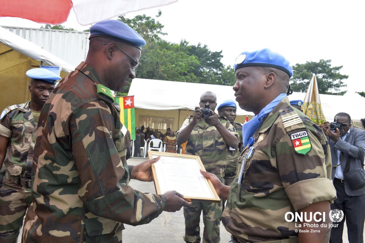 Medal Awarding to Togolese peacekeepers : the Deputy Force Commander of UNOCI handing over the certificate to the Chief of the contingent ( Abidjan, August 2016 )