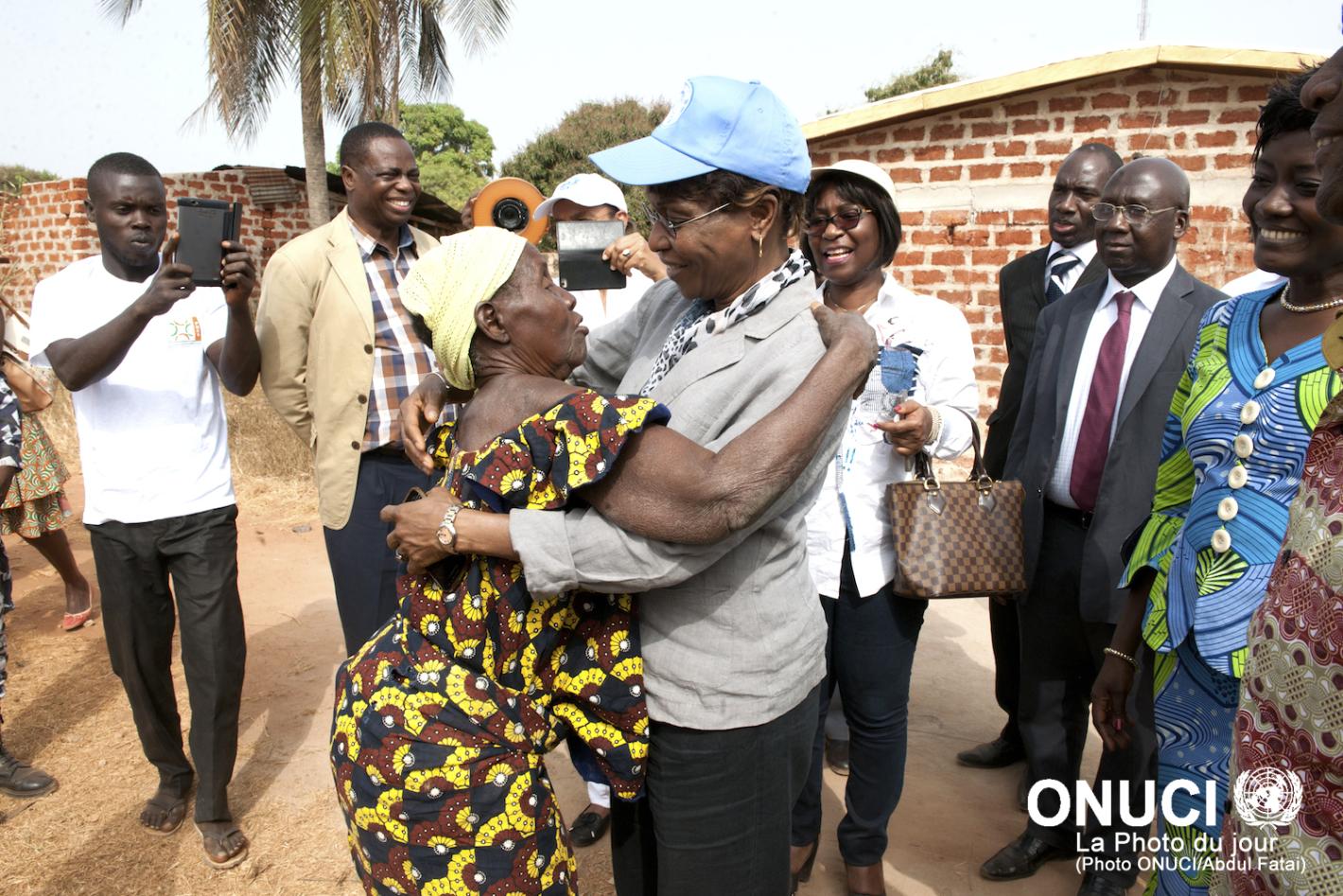 The Special Representative, Aïchatou Mindaoudou, exchanges warm greetings with a local woman, on the margins of the compensation ceremony for victims of the Bayota incidents (Bayota, January 2016)